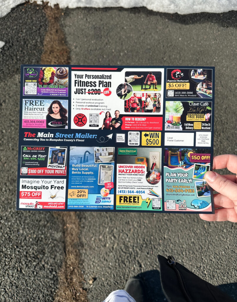 With that being said, any advertising is important which is why I recommend being seen in as many places as you can. With The Main Street Mailer, you will be seen not only on postcards, but also on stacks of flyers placed all around local hot spots as well as a shared website with your own dedicated page and social media ads targeting the shared site. You’ll be seen up to 960,000 times in various places.