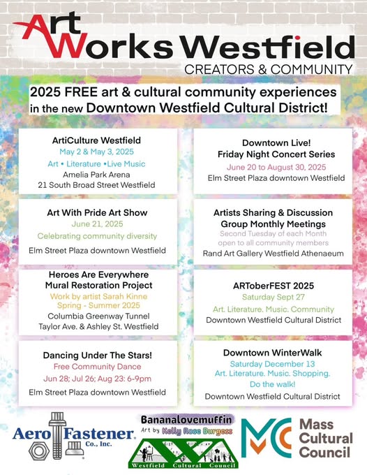 ArtWorks Westfield is a nonprofit arts and cultural organization dedicated to celebrating and promoting the creative talent of Westfield and surrounding communities. Through year-round events and initiatives, ArtWorks brings together artists, musicians, writers, and performers to create free, engaging cultural experiences that enhance the vibrancy of downtown Westfield.